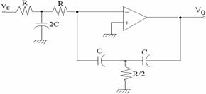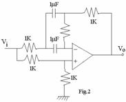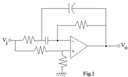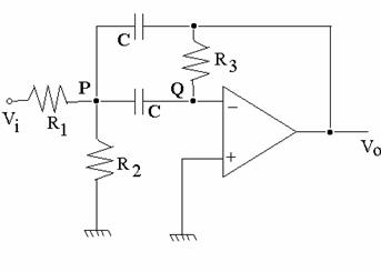 b. Design an active second order band pass filter with a centre frequency of 2 KHz, a bandwidth of 150 Hz and a midband gain of 20. Derive the equations used. (7)