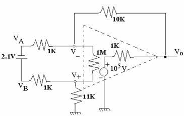 Q2.a. With Opamp replaced by its equivalent circuit, the given amplifier can be drawn as shown in the figure where Vi = -2.1V. The node equations at negative and positive terminals of the Opamp may be respectively written as
