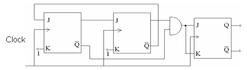 b. The circuit diagram of a synchronous counter is shown below. Determine the sequence of states of the counter assuming that the initial state is ‘000’. Give your answer in a tabular form showing the present state, next state and the JK inputs. From the table determine the modulus of the counter. (7)