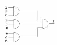 Q.7 a. In a certain application, four inputs A, B, C, D (all are available in complemented and uncomplemented forms) are fed to a logic circuit, producing an output F, which operates a relay. The relay turns on when F (ABCD) = 1 for the following states of the inputs (ABCD); 0000, 0010, 0101, 0110, 1101 and 1110. States 1000 and 1001 do not occur and for the remaining states, the relay is off. Minimise F and realize it using minimum number of 3-input NAND gates. (7)